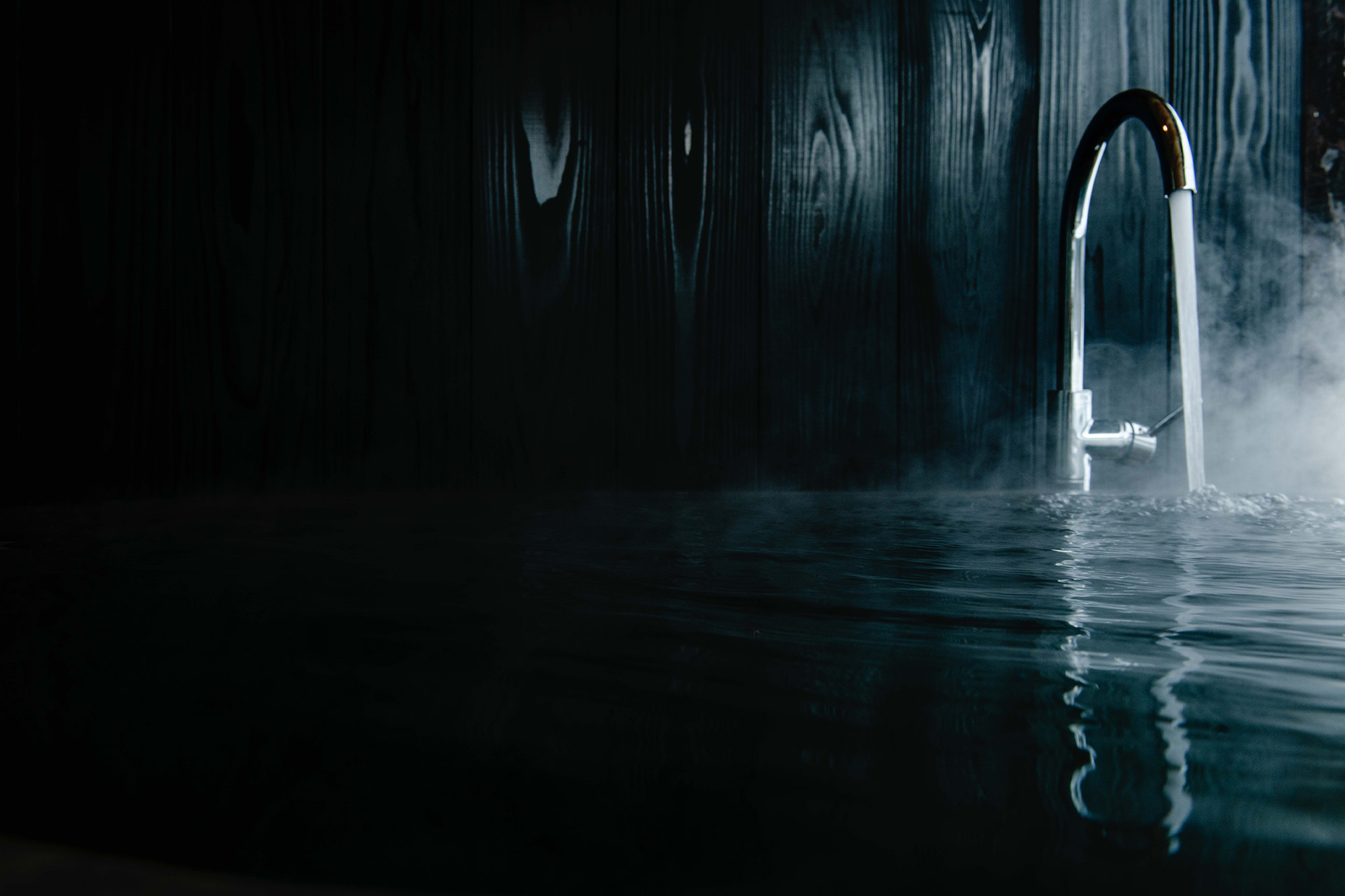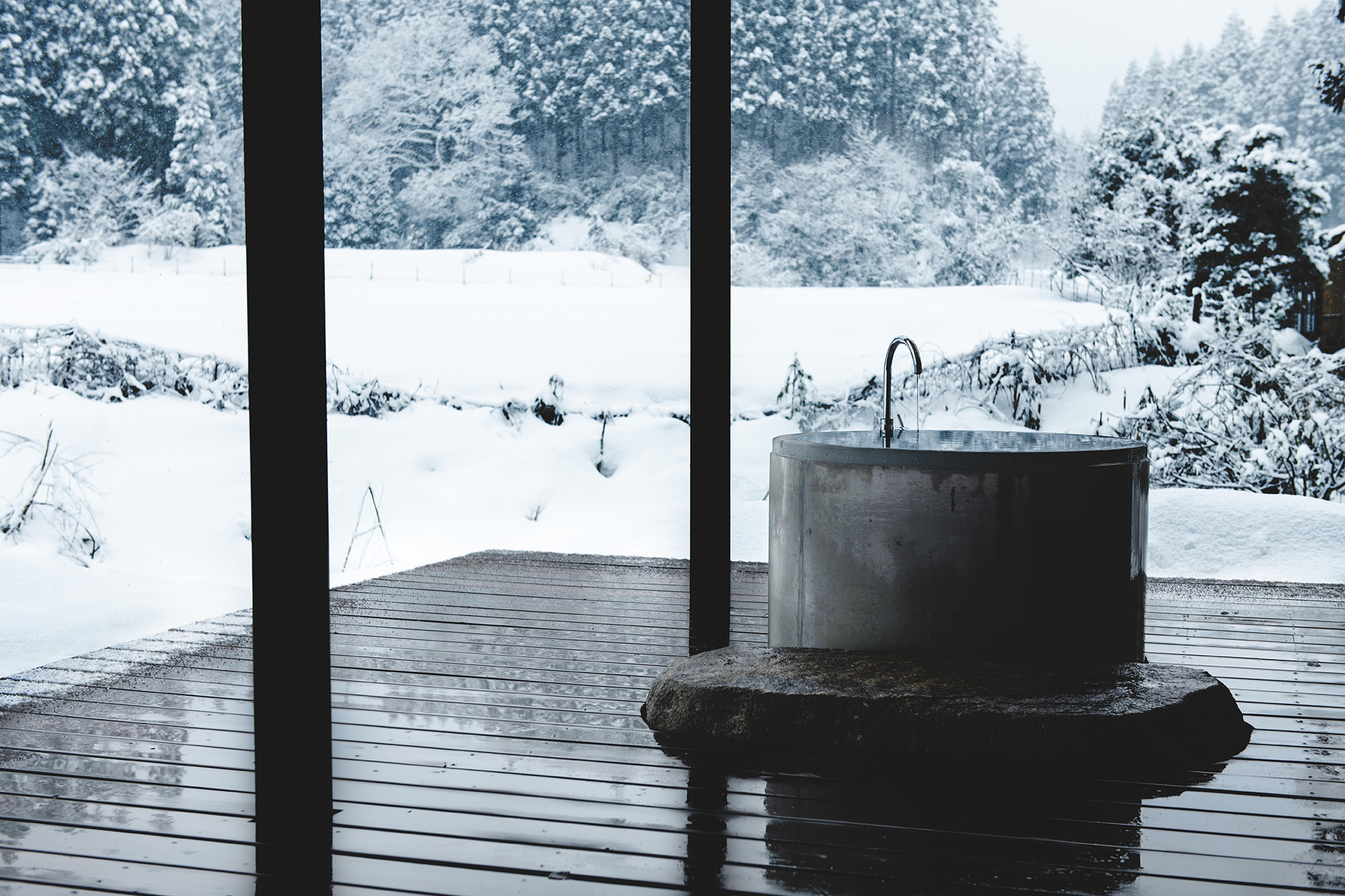 大きなドカンを用いた遊び心あふれる水風呂に満ちる湧水は、無骨なフォルムとは対照的に肌に触れると驚くほどやわらかく、心地よい冷たさが全身を駆け巡る。童心に帰るような感覚とともに、心も体もすっきりと研ぎ澄まされる特別な水の時間を楽しむ。