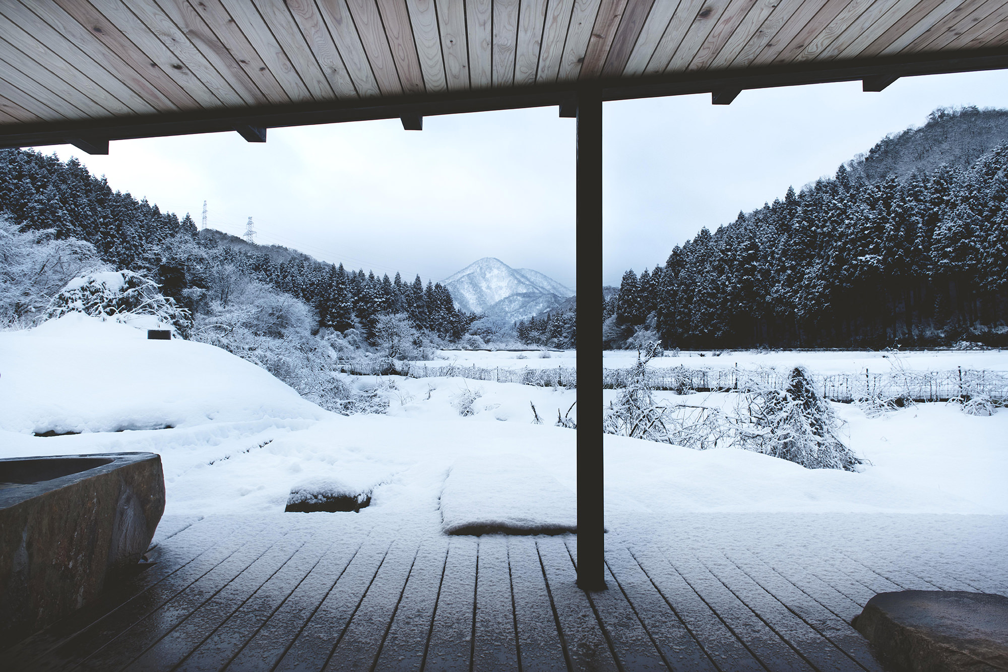 半屋外の外気浴スペースで、目の前に広がる鞍掛山を望む。熱を帯びた体が心地よく鎮まり、深く息を吸い込むたびに澄んだ空気が巡る。雄大な自然に抱かれる贅沢な時間を過ごす。